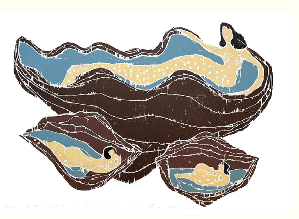 Japanese style woodcut in 6 colors with hand colored pearls by the artist