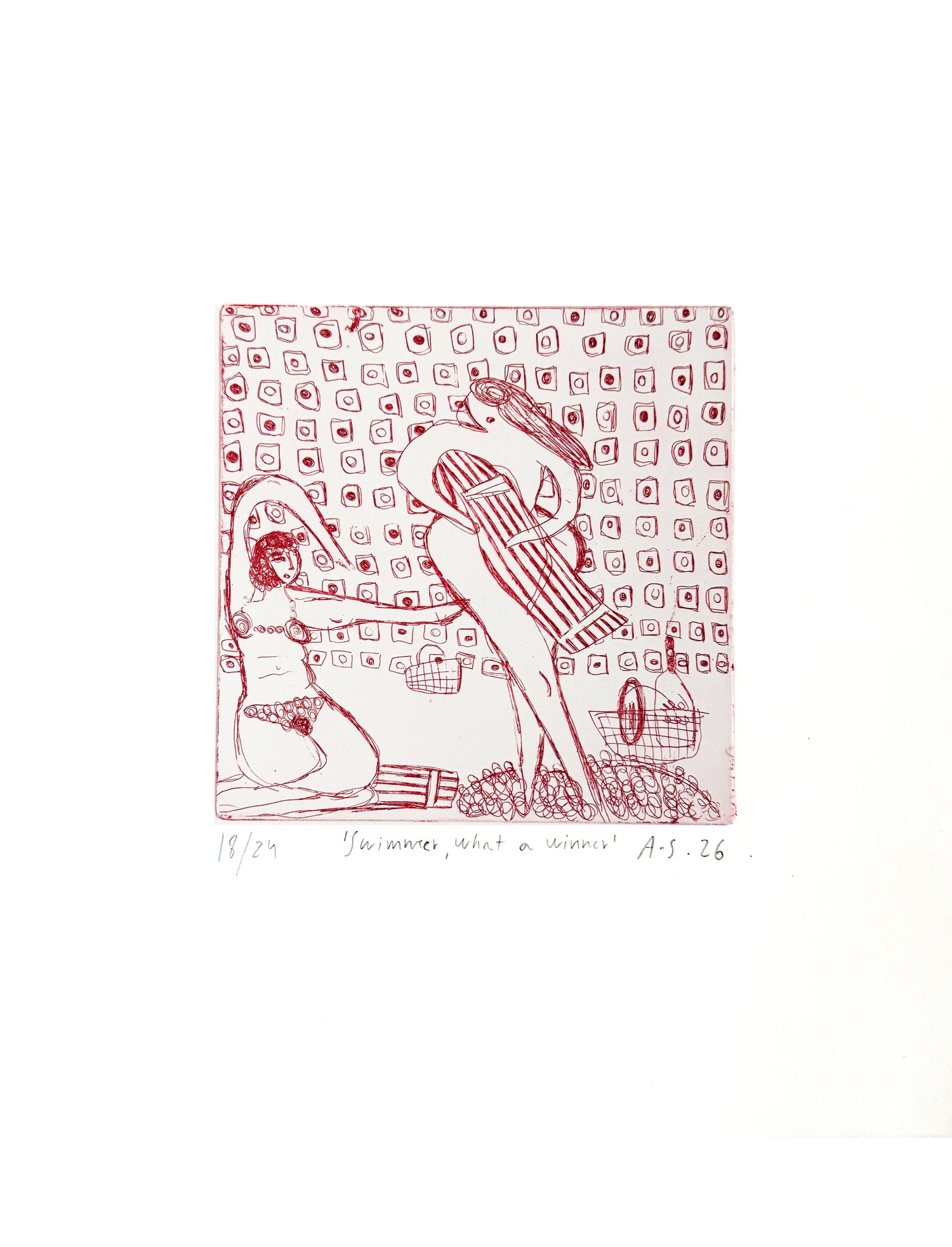 Line etching with red ink on white paper